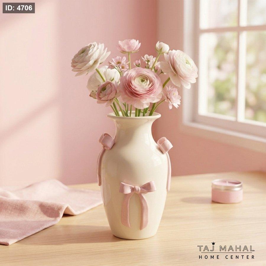 مزهرية سيراميك أبيض بتصميم فيونكات وردية