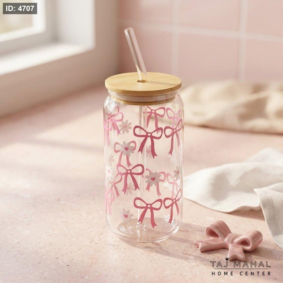 مج زجاجي مع غطاء خشبي ومصاصة زجاج بنقوش فيونكات وردية وزهور بيضاء