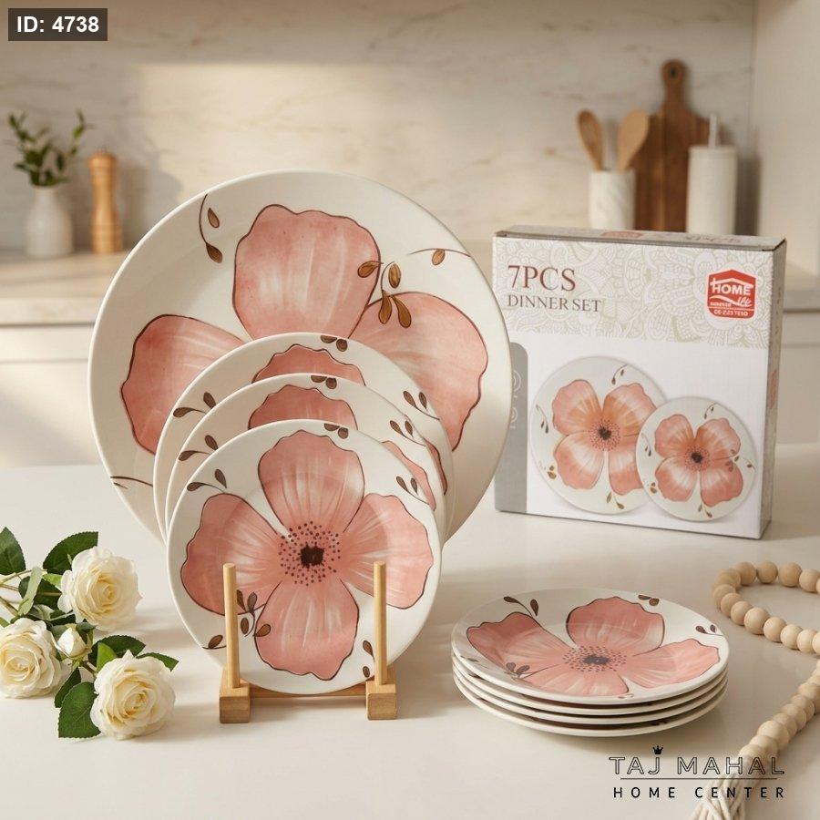 طقم صحون سفرة بورسلان 7 قطع بنقشة الزهور الوردية