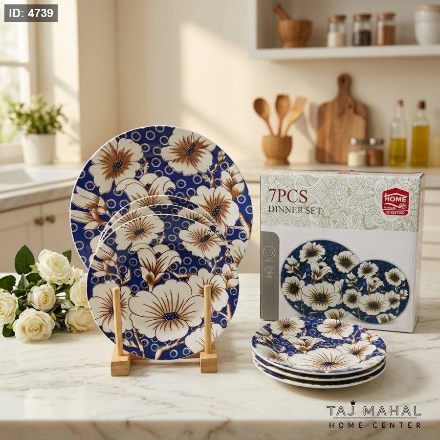 طقم عشاء بورسلان 7 قطع - بنقشة الأزهار البيضاء والخلفية الزرقاء الملكية