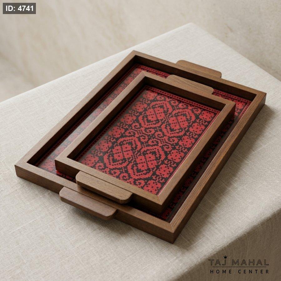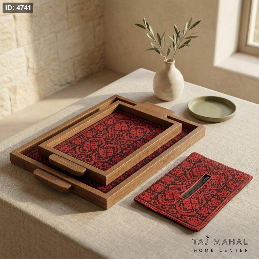 صواني تقديم خشبية: طقم مكون من قطعتين (كبيرة ووسط) مصنوع من خشب عالي الجودة بلمسات نهائية ناعمة، مزينة بقاعدة مطرزة بنقوش هندسية أصيلة محمية بطبقة زجاجية متينة لسهولة التنظيف.
