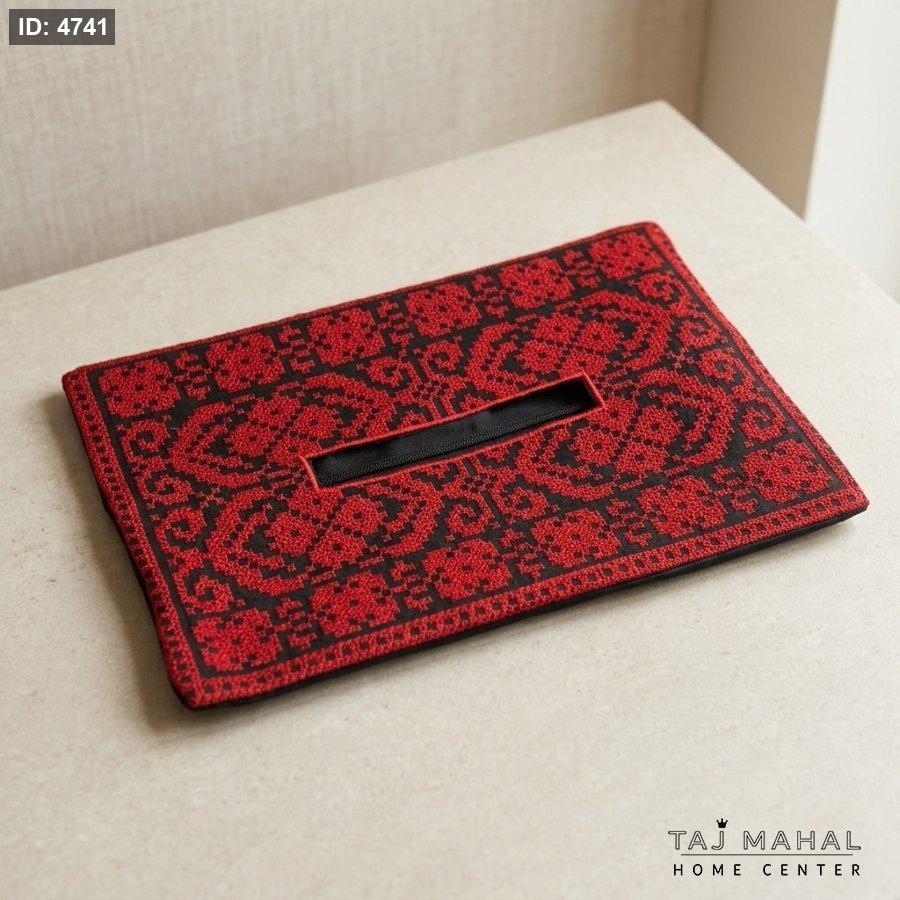 غطاء مناديل قماشي: غطاء فاخر من قماش الإيتامين، مطرز بالكامل بنقشة مطابقة للصواني، مصمم بفتحة انسيابية تضمن سهولة الاستخدام وتضفي لمسة فنية على طاولة الضيافة.
