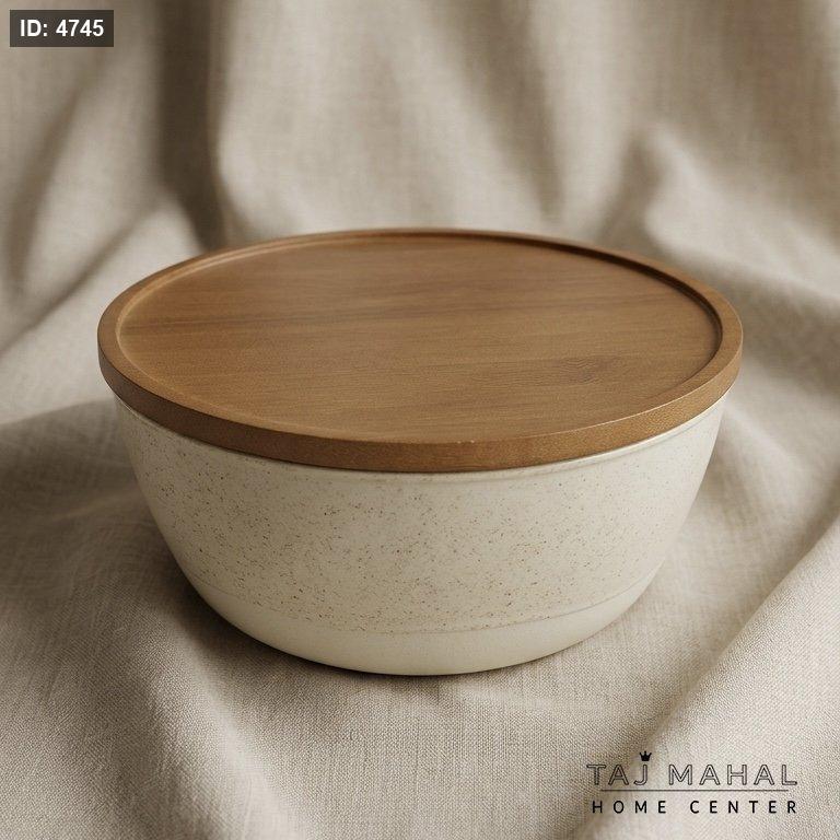 وعاء تقديم أنيق يجمع بين الحداثة واللمسة الريفية، يتميز بلون كريمي منقط وتصميم متين مثالي للسلطات والمخبوزات. يأتي مع غطاء من الخشب الطبيعي يوفر إغلاقاً محكماً للحفاظ على نضارة الطعام، ويمكن استخدامه كقاعدة تقديم مميزة.