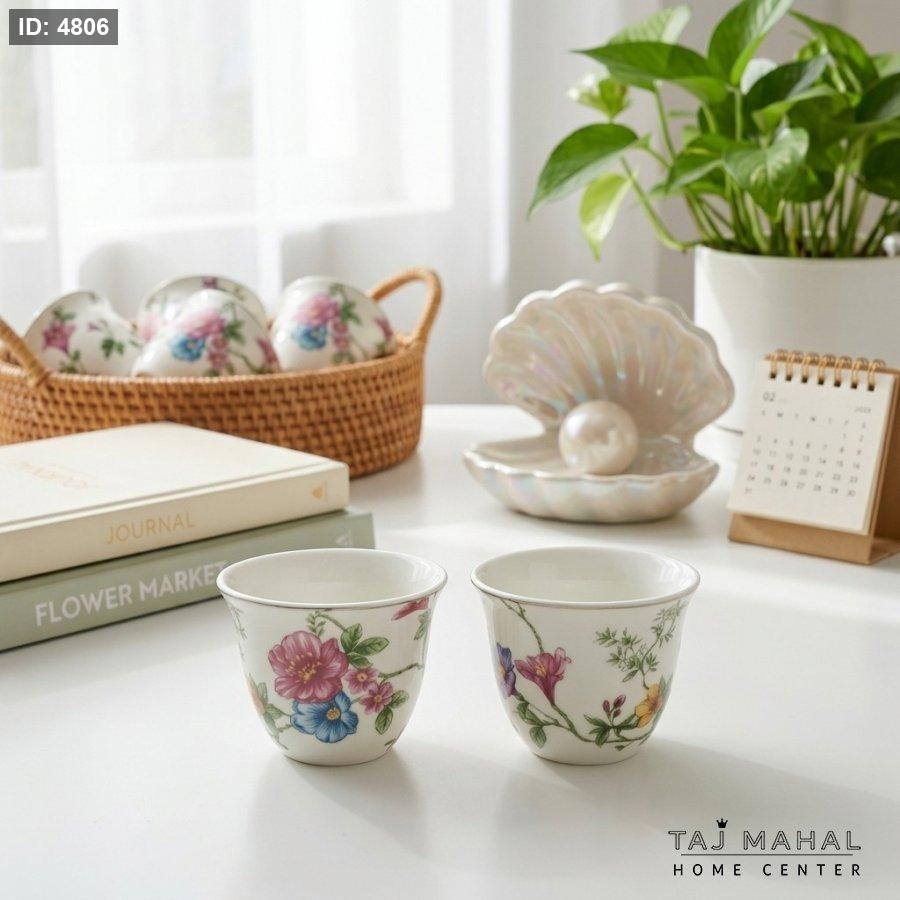 طقم فناجين قهوة عربية بورسلان مزخرفة بنقوش زهور ملونة