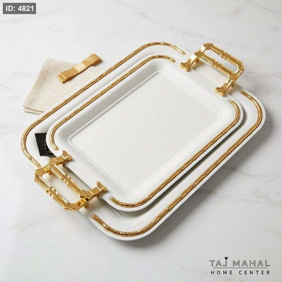 طقم صواني تقديم باللون الأبيض مع حواف ومقابض ذهبية