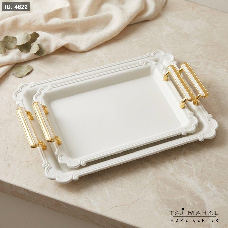 طقم صواني تقديم مستطيلة بلون أبيض وحواف مزخرفة مع مقابض ذهبية عريضة