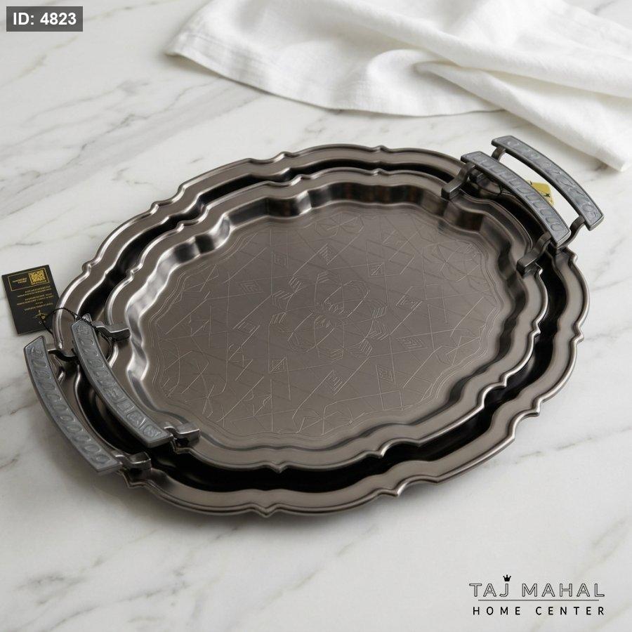 طقم صواني تقديم بيضاوية فضية بنقوش هندسية على السطح