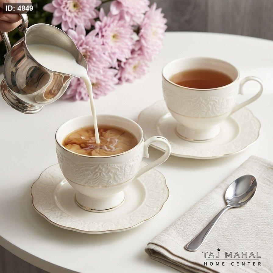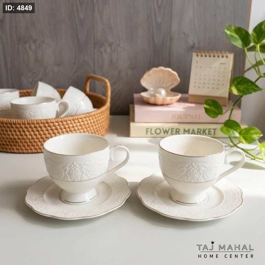 طقم فناجين شاي بورسلان أبيض بزخارف بارزة