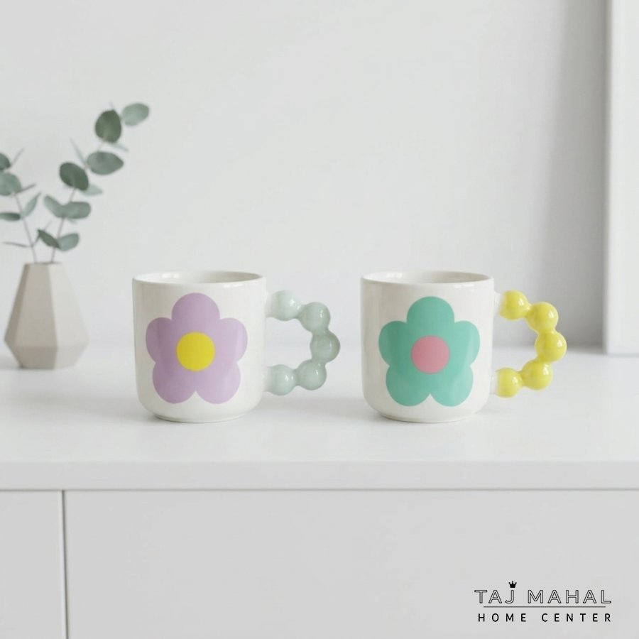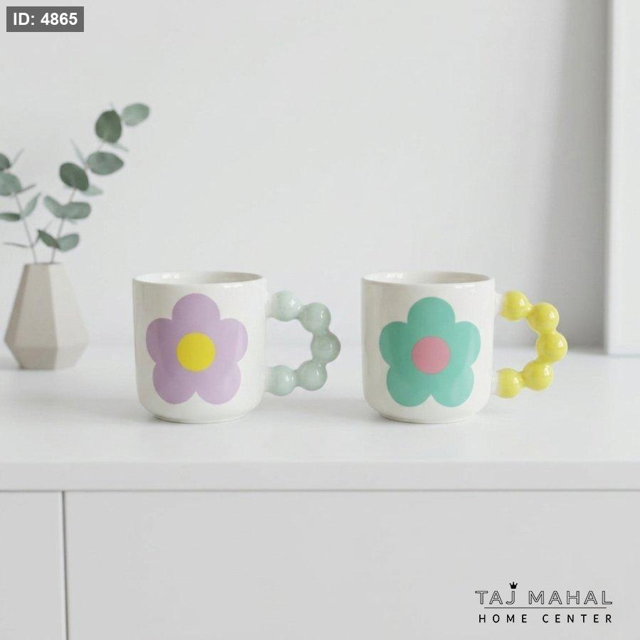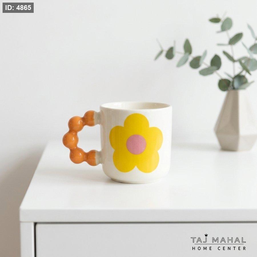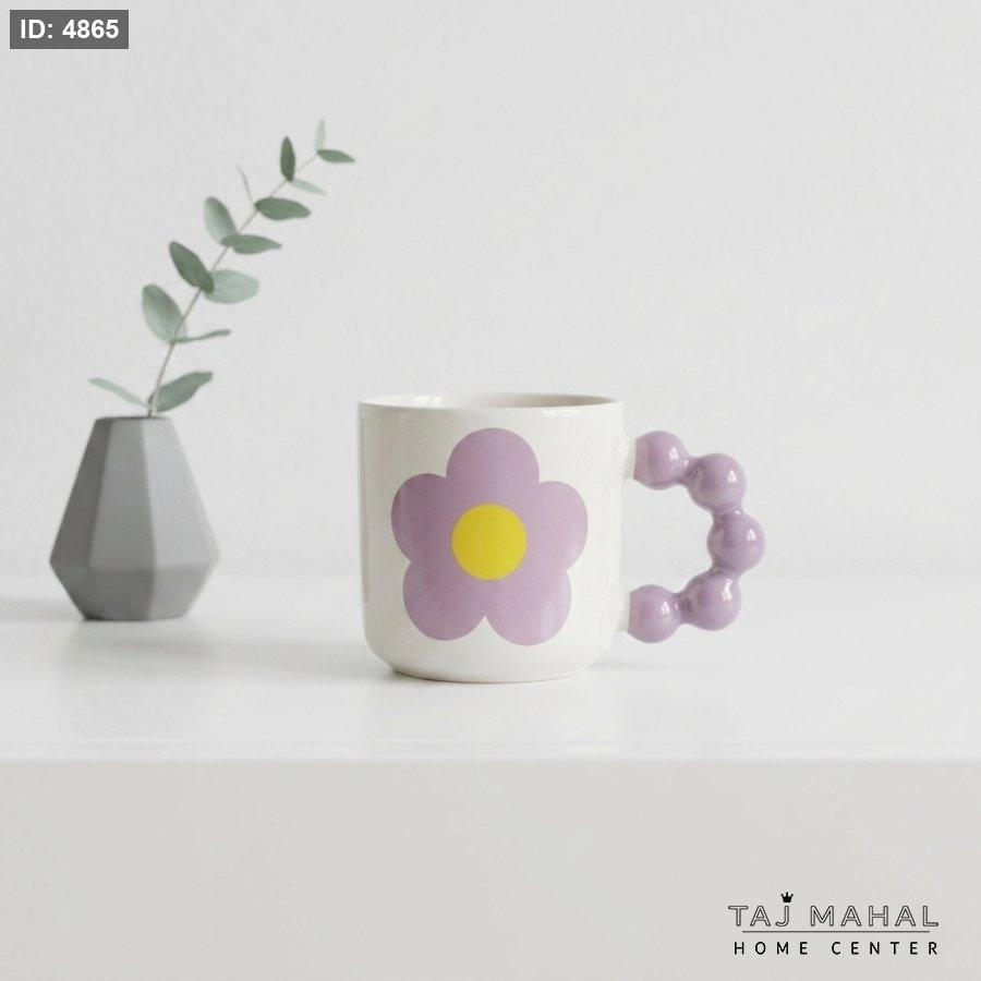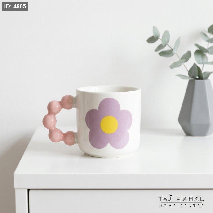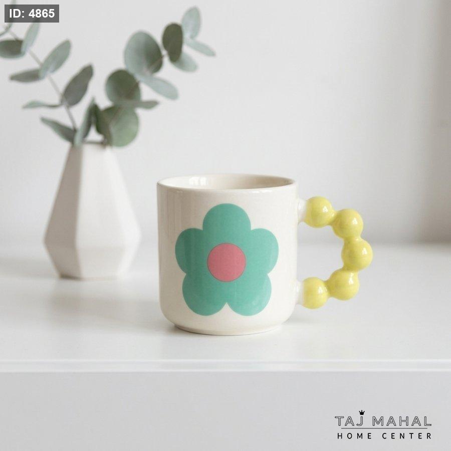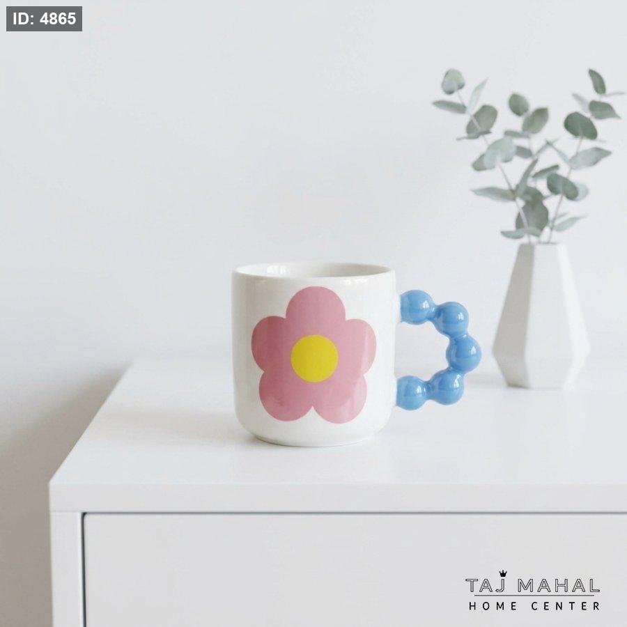 مج سيراميك ابيض برسم زهرة مع يد بتصميم بابلز